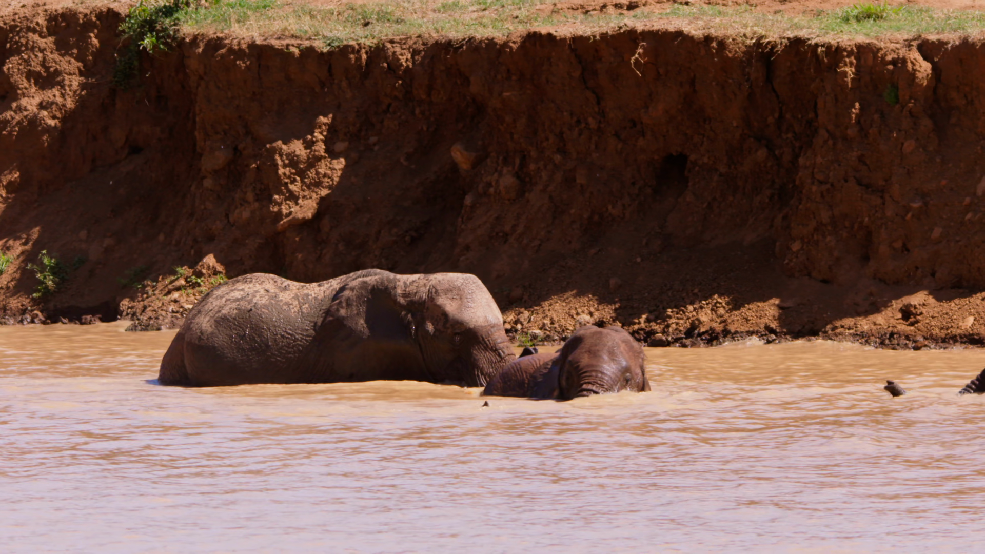 Wide Pan Of A Pair African Bush Elephants Loxodonta Africana Walking In A Waterhole In The Savannah At Midday In KenyaÂ