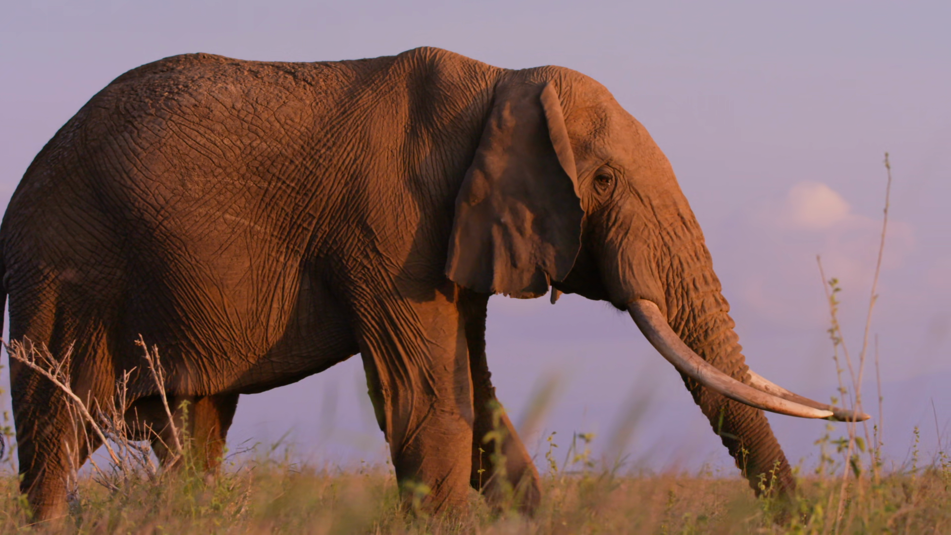 Wide Pan Of An African Bush Elephant Loxodonta Africana Walking While Grazing In The Grassland Against A Magenta Sky In KenyaÂ