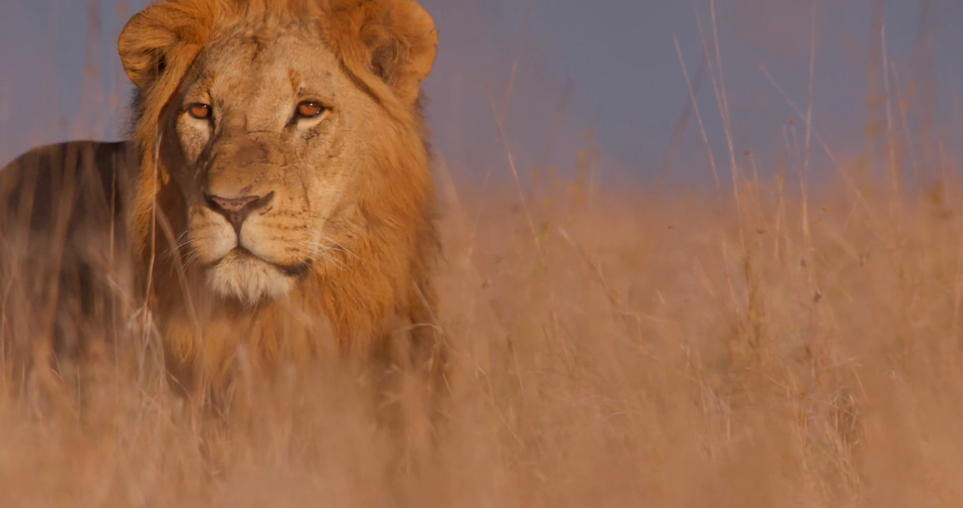 Wide Pan Shot Of A Male Lion Panthera Leo Walking Through Grass Before Stopping To Scan The Area During The Morning In KenyaÂ