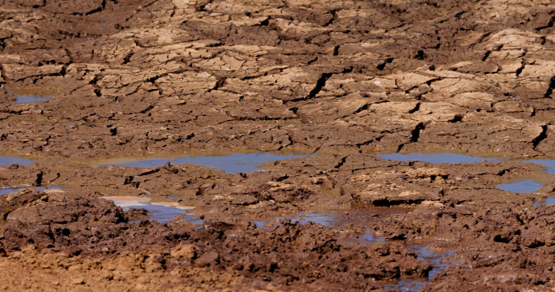 Wide Pan Shot Of Shallow Patches Of Water Within A Watering Hole During The Afternoon In KenyaÂ