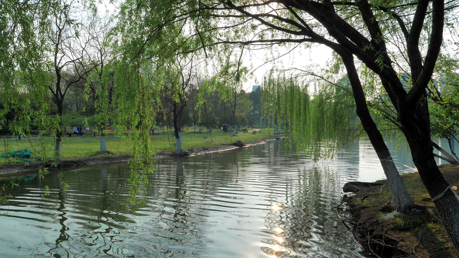 Willow Tree Branches With Green Leaves In Front Of A Pond With Reflections And Ripples On The Water Surface And Walking People On The BackgroundÂ