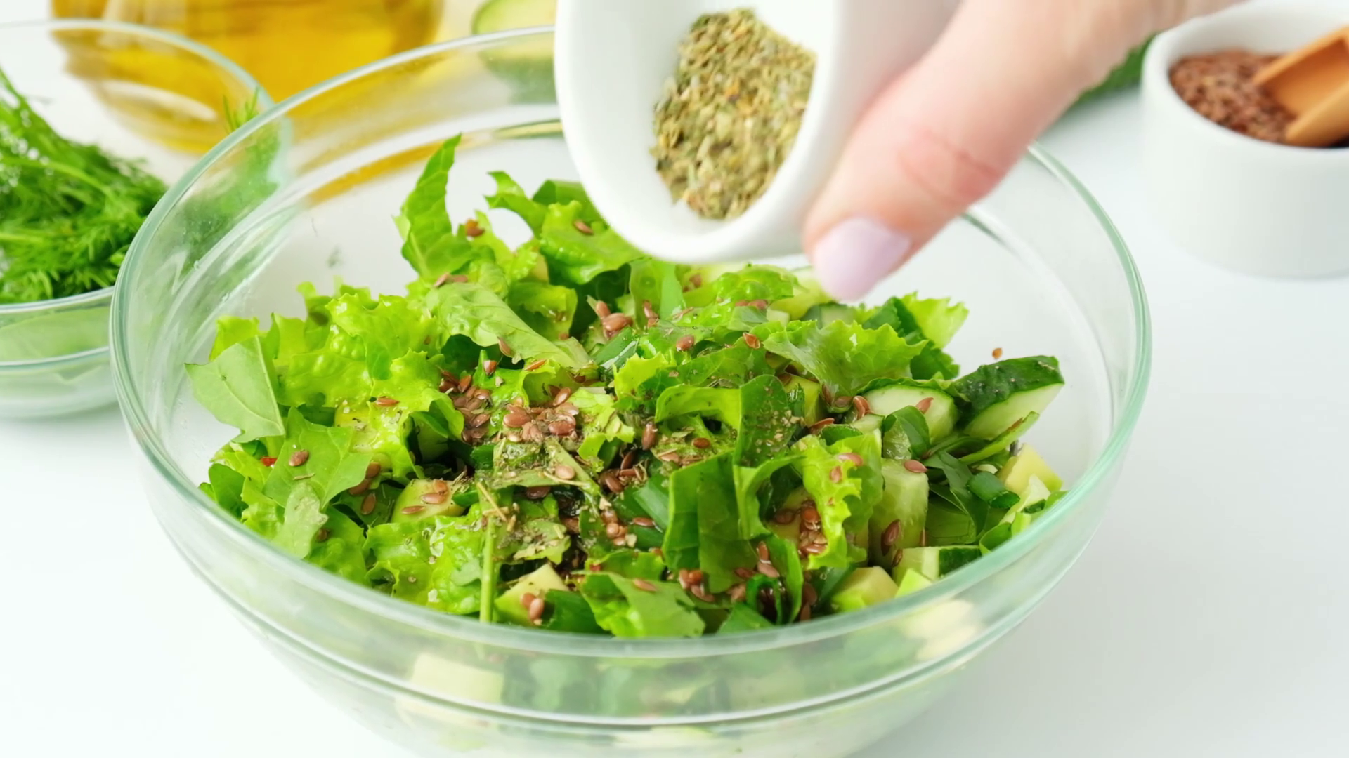 Woman Cooking Salad Of Fresh Green Vegetables And Herbs Cooking Healthy Diet Or Vegetarian Food Female Hands Add Spices Step By StepÂ