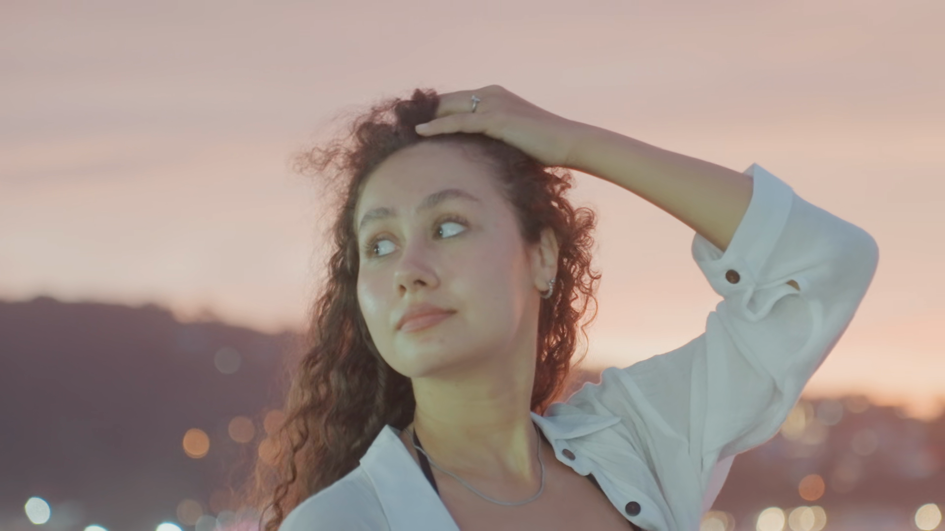 Woman Gazes Through Hair By Tranquil Shoreline Quiet Dusk Scene With City Lights Shimmering Behind Woman Gentle Evening Setting ShowingÂ