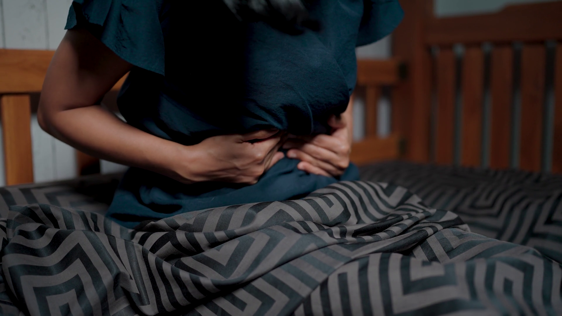 Woman Lies In Bed And Feels Pain And Inflammation Causing The Uterine Muscles To Contract Causing Severe Menstrual Cramps In The Abdomen And Pain To The Point Where She Cannot SleepÂ