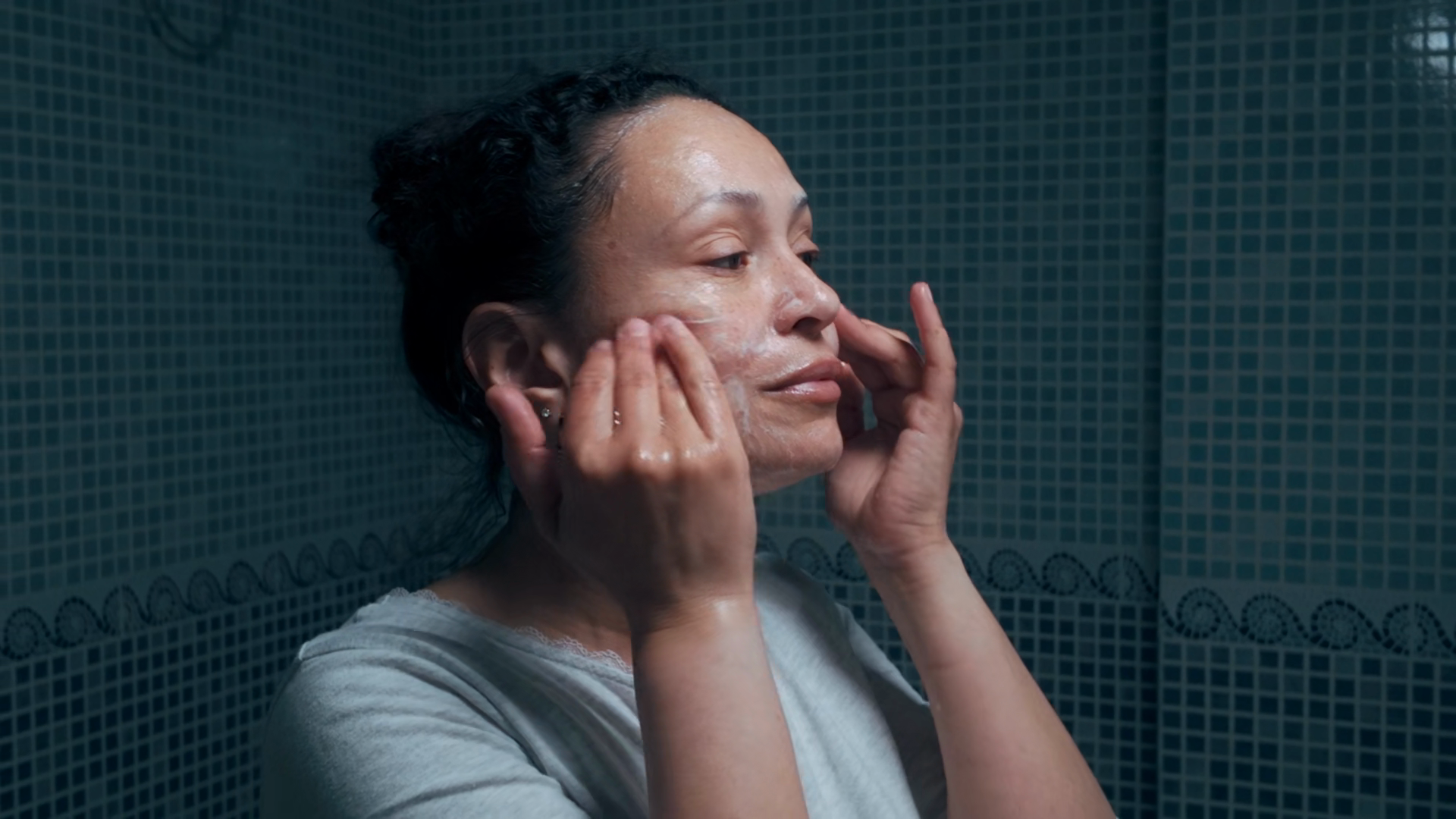 Woman Performing Daily Facial Skincare Routine In Bathroom MirrorÂ
