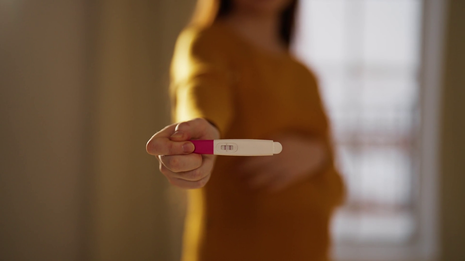 Woman Shows Positive Pregnancy Test Unrecognizable Female Future Mother In Orange Dress Expecting Baby Hand Closeup Fertility WomenÂ