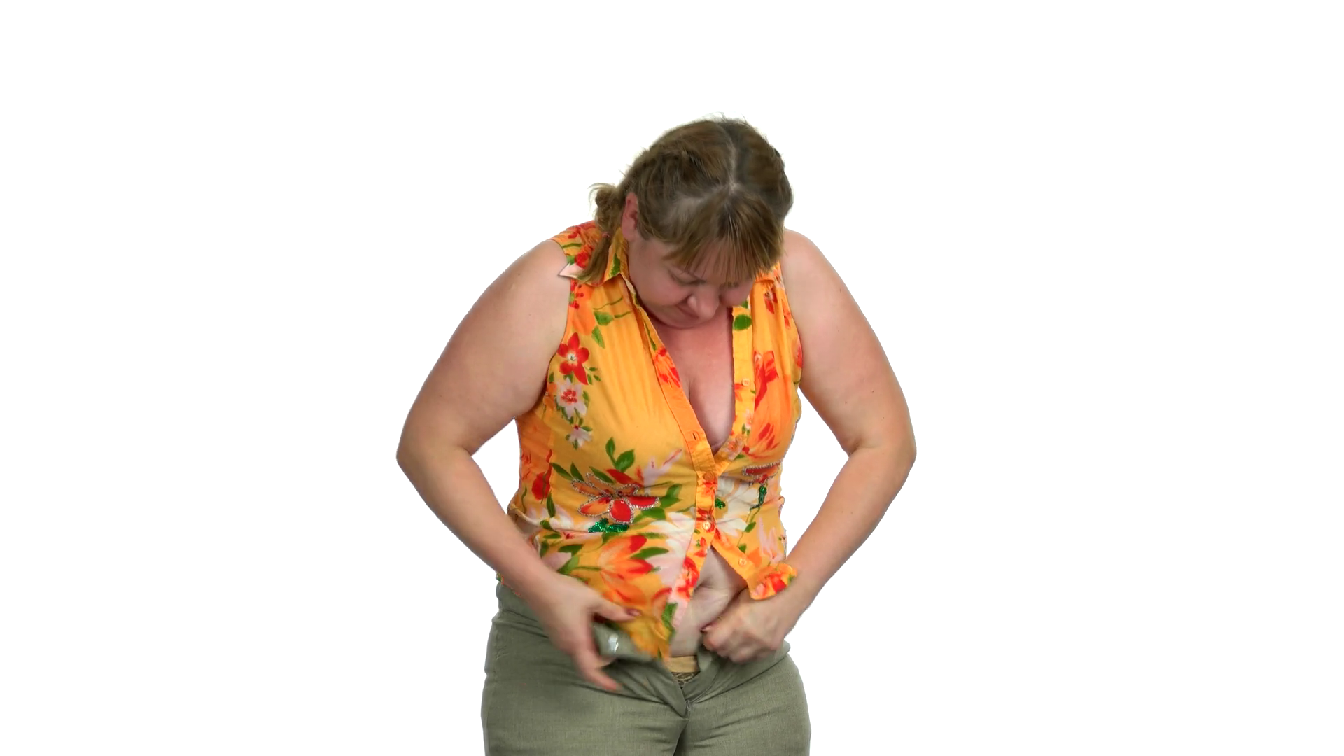 Woman Struggling To Zip Tight Pants Overweight Woman Can Not Fasten Her Tight Clothes Because Of Her Big Belly Isolated On White BackgroundÂ