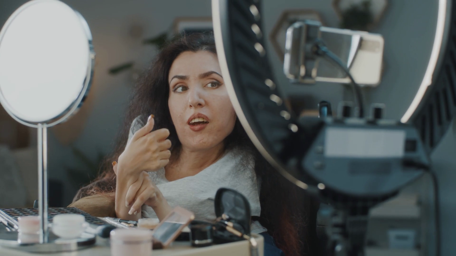 Woman With A Spinal Muscular Atrophy Shooting A Makeup Tutorial In Sunlight On Her Smartphone Or Doing Live Video Stream In Social Media Using Smartphone Holder Ring Led Lamp And TripodÂ