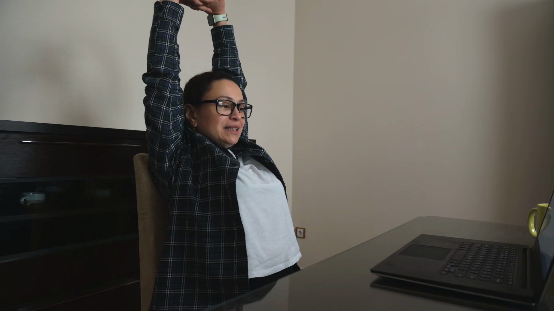 Woman Working On Laptop Takes A Break To Stretch And Relax At HomeÂ