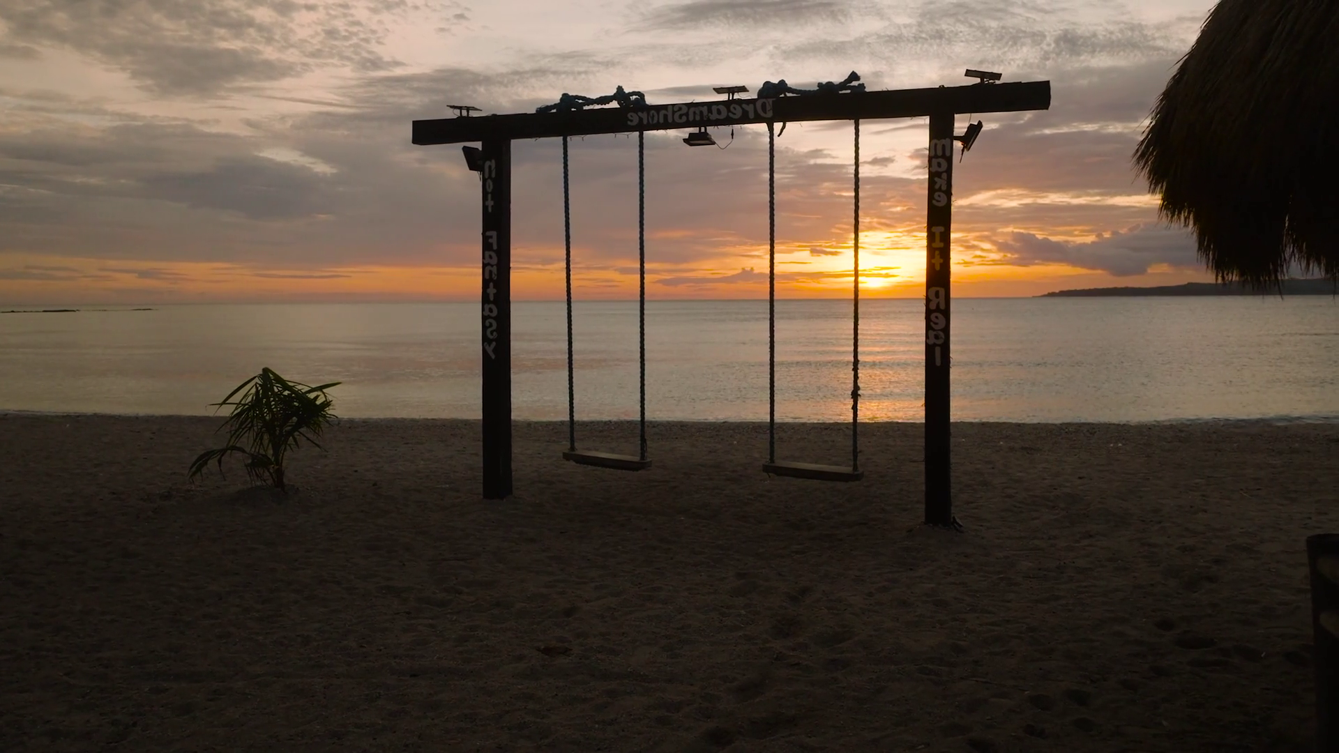 Wooden Swings On A Beach With A Golden Sunset Reflecting On Calm Sea Waters Santa Fe Tablas Romblon PhilippinesÂ