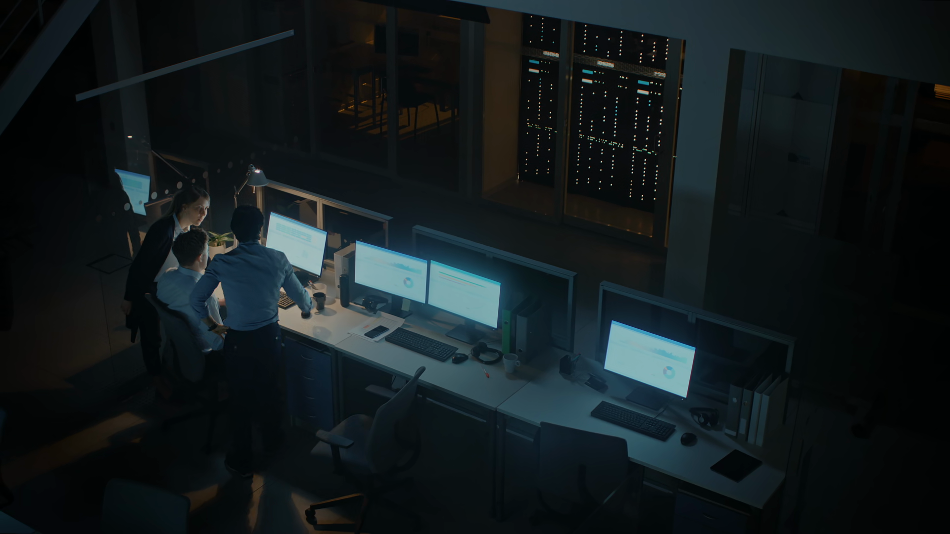 Working Late At Night In The Office Businesswoman Using Desktop Computer Having Discussion Analyzing Using Documents Solving Problems Finishing Project Elevated High Angle ShotÂ