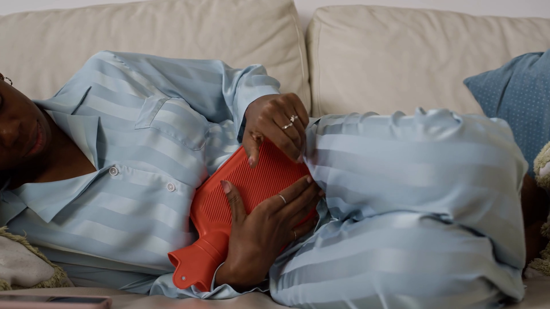 Young African American Woman Lying Down On Couch Using Heating Pad To Ease Menstrual Cramps During Her Period In Calm Home SettingÂ