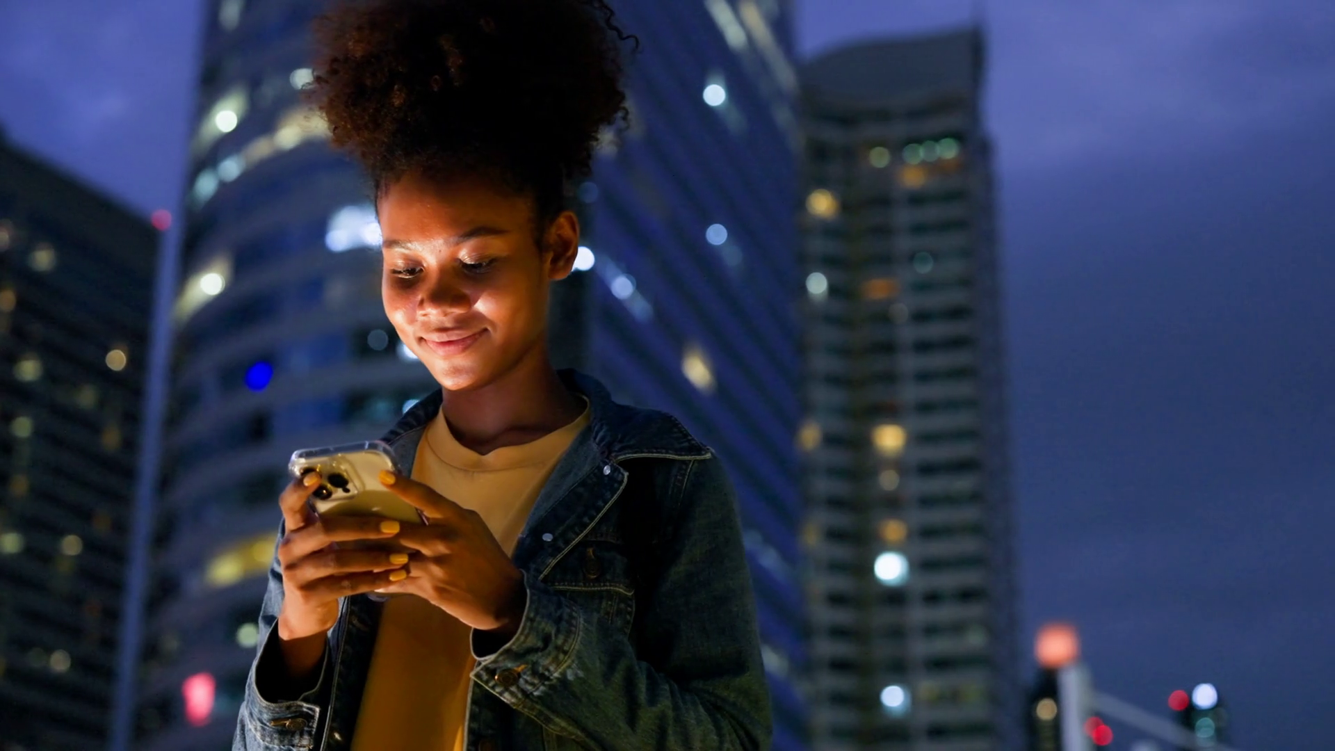 Young African Woman Walking In City Street At Night Using Mobile Smartphone Happy Afro Woman Standing And Typing Messages On Her Mobile PhoneÂ
