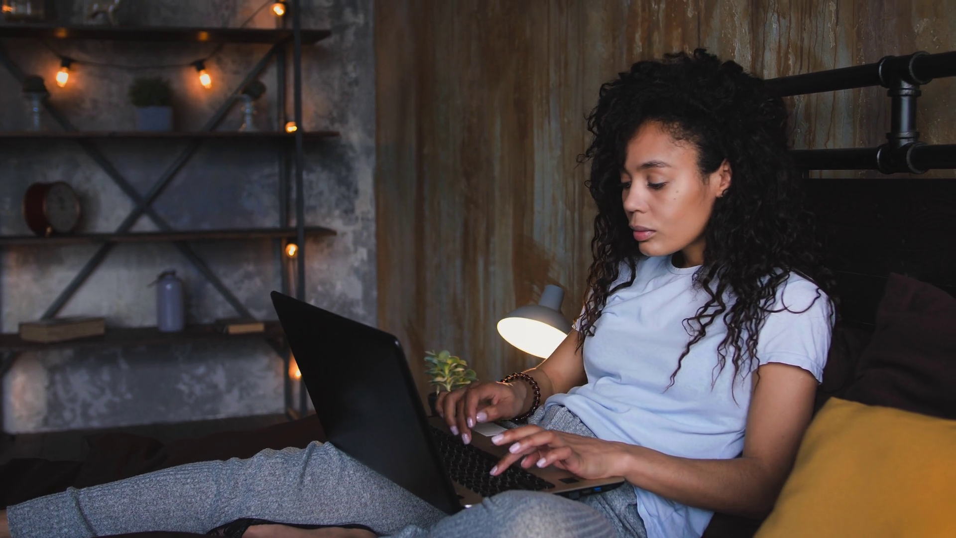 Young Woman Using Laptop In Her Loft Bedroom Work From Home ConceptÂ
