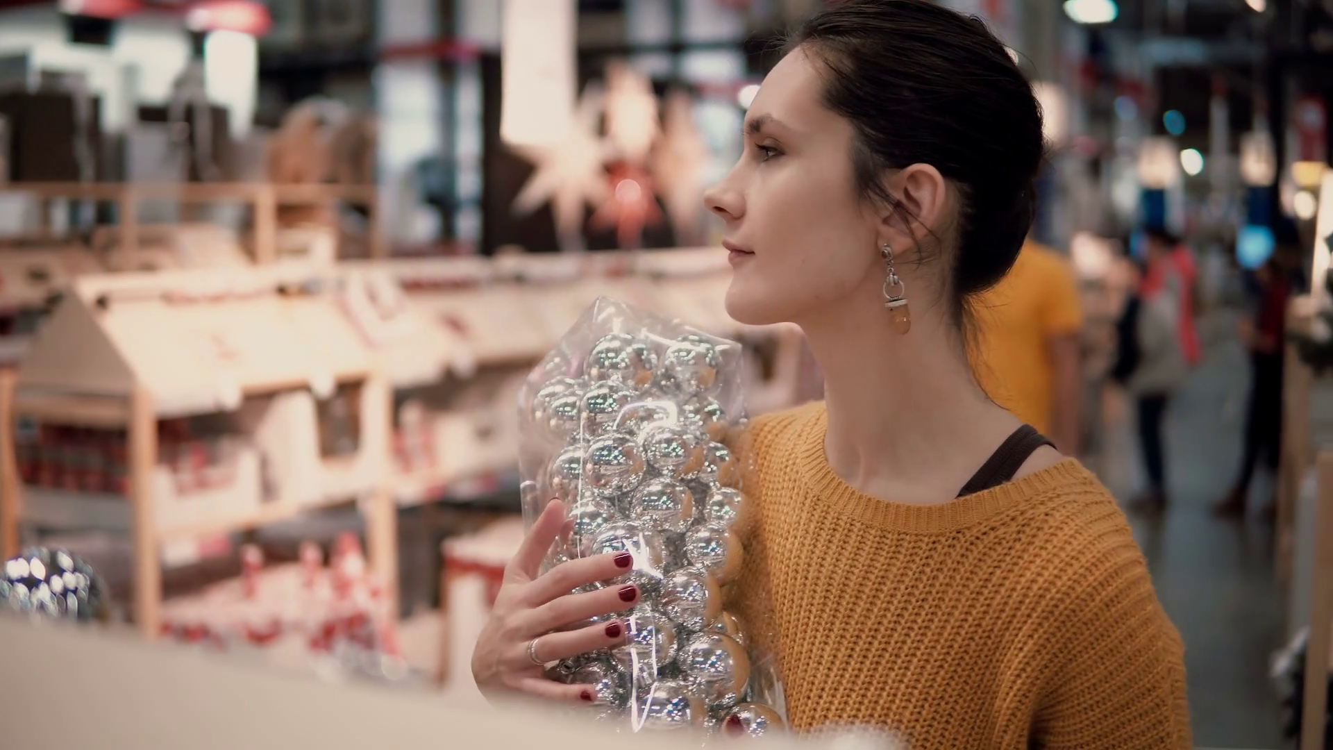 Brunette Girl Shopping For Colorful Christmas Decor At The StoreÂ