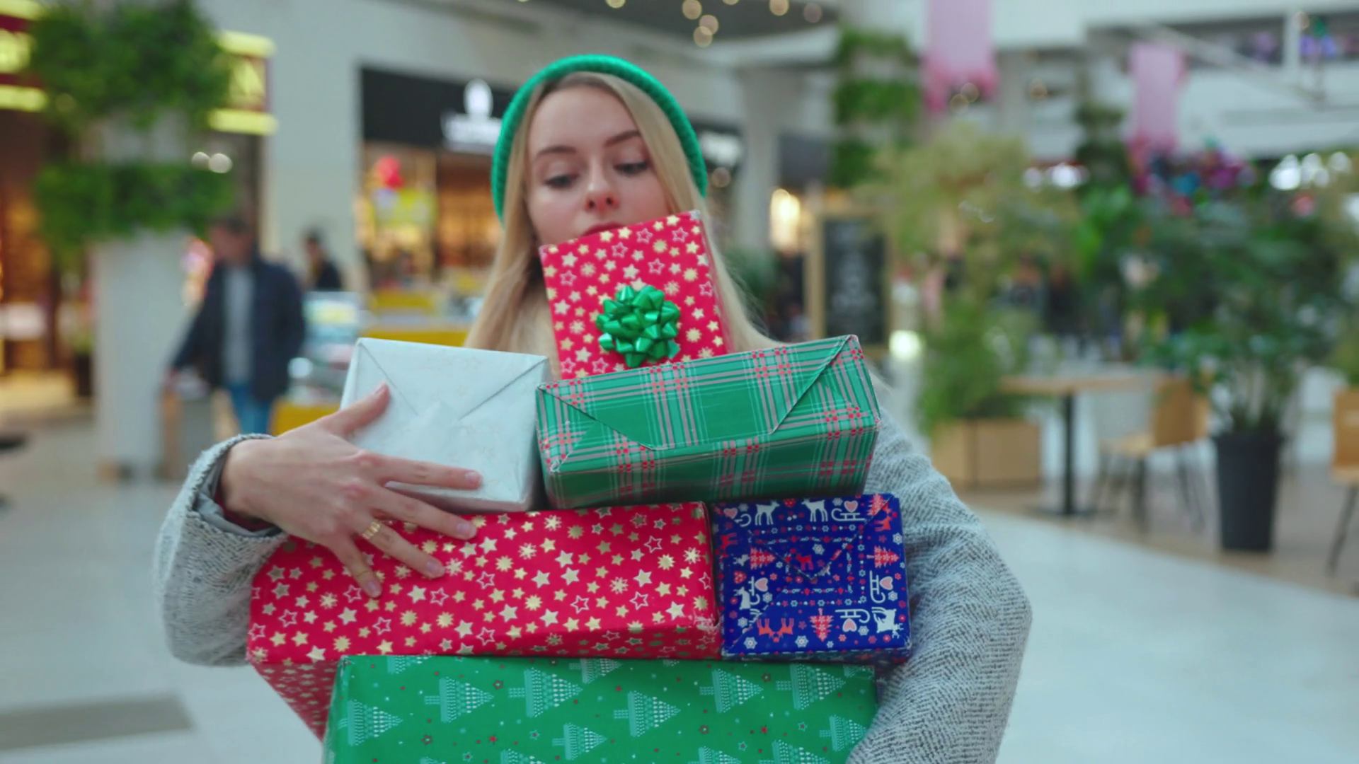 Young Beautiful Woman Wear Hat Walking With Christmas Presents Try Holds The Boxes Carefully In Shopping Mall Smile Happy Buy New YearÂ