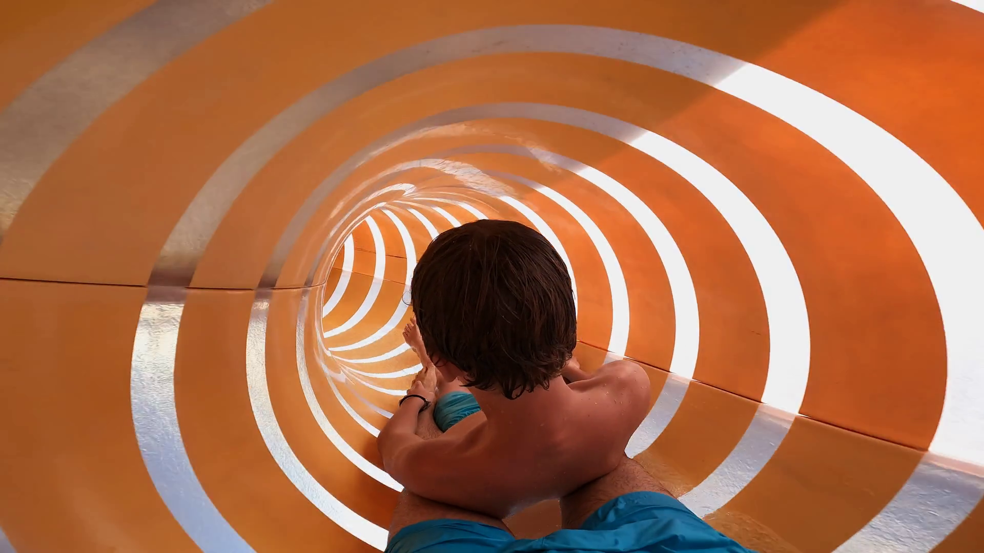 Young Boy Enjoying The Thrill Of Twisting Down A Vibrant Water Slide Filled With Excitement And Joy On A Sunny Day