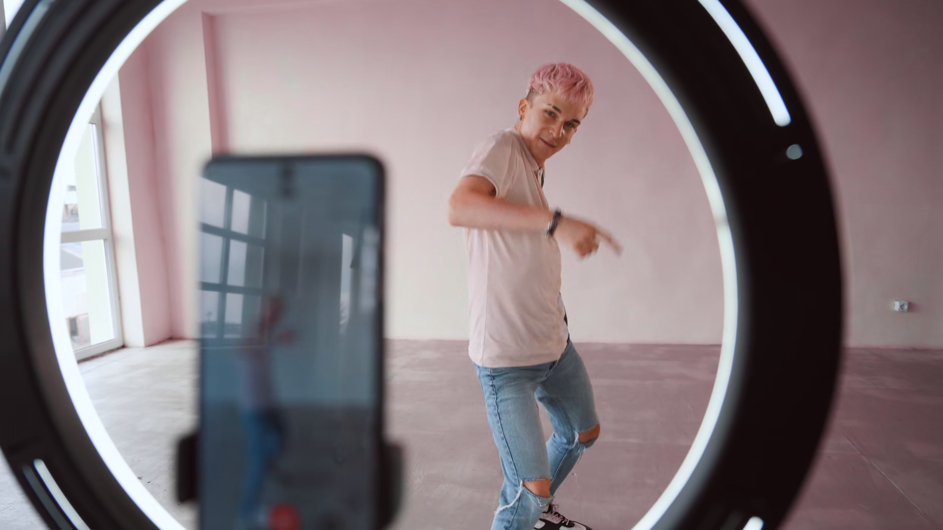 Young Boy Filming Videos And Dancing By Smartphone Camera Set On Ring Light Blogger Concept Copy SpaceÂ