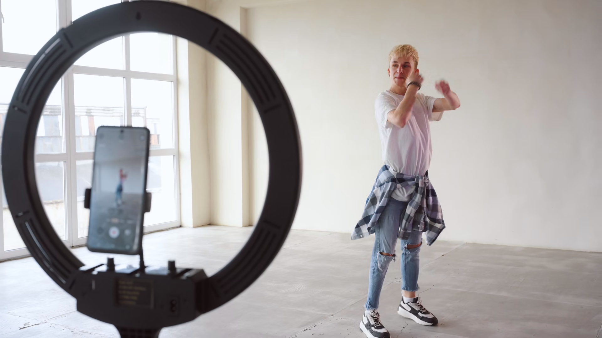 Young Boy Filming Videos And Dancing By Smartphone Camera Set On Ring Light Young Blogger Concept Copy SpaceÂ