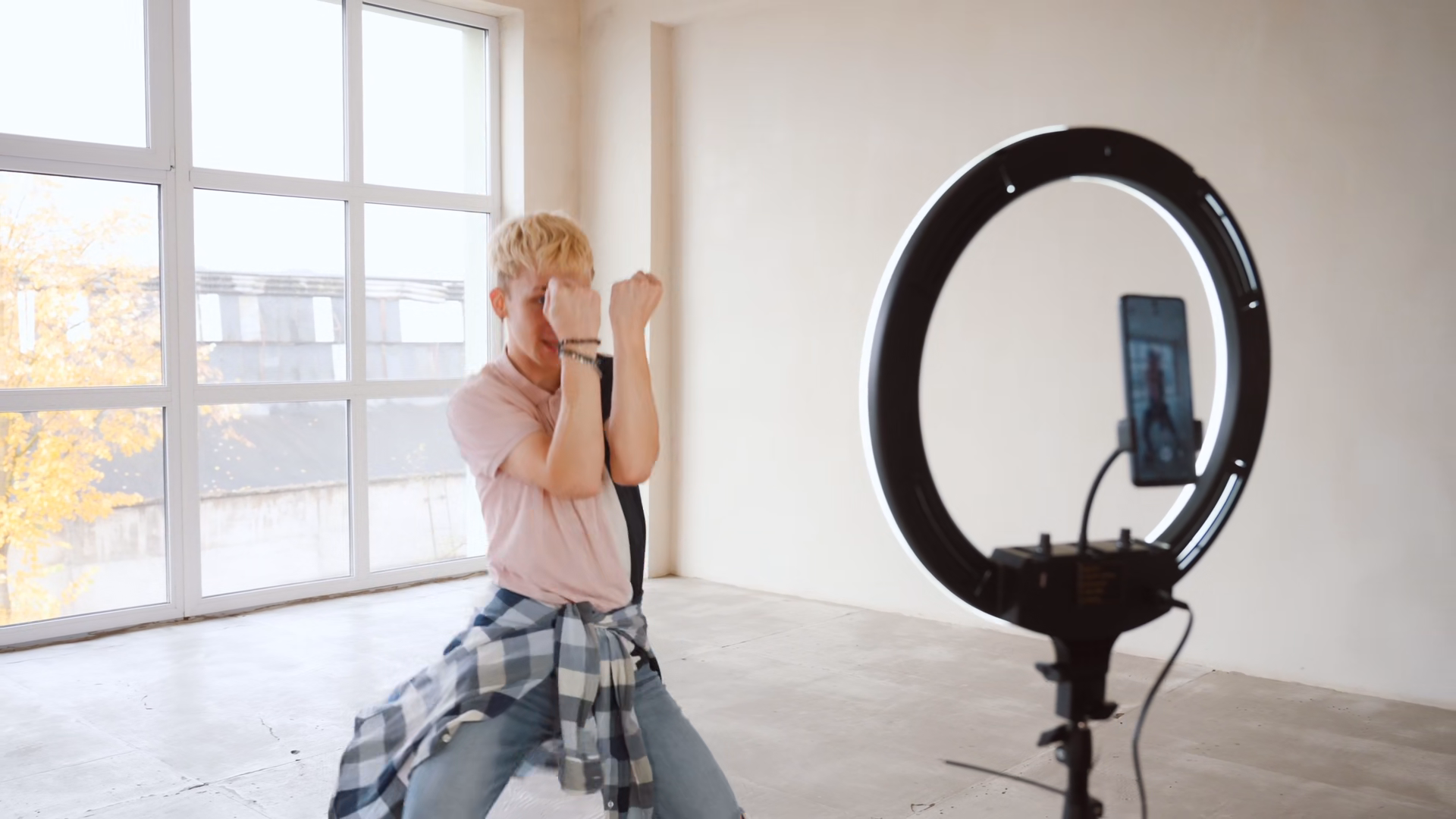 Young Boy Filming Videos And Dancing By Smartphone Camera Set On Ring Light Young Blogger Concept Copy SpaceÂ