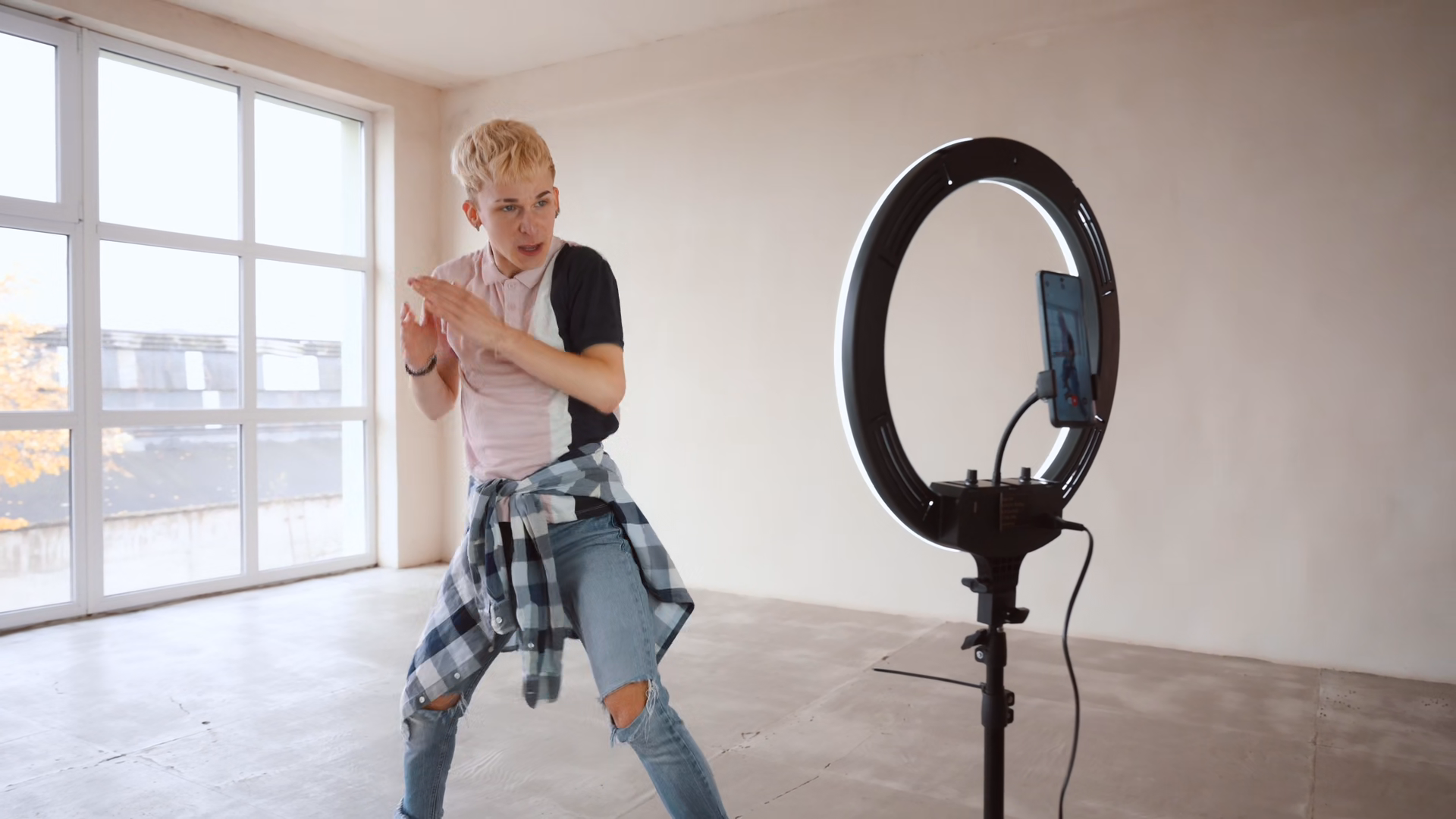 Young Boy Filming Videos And Dancing By Smartphone Camera Set On Ring Light Young Blogger Concept Copy SpaceÂ