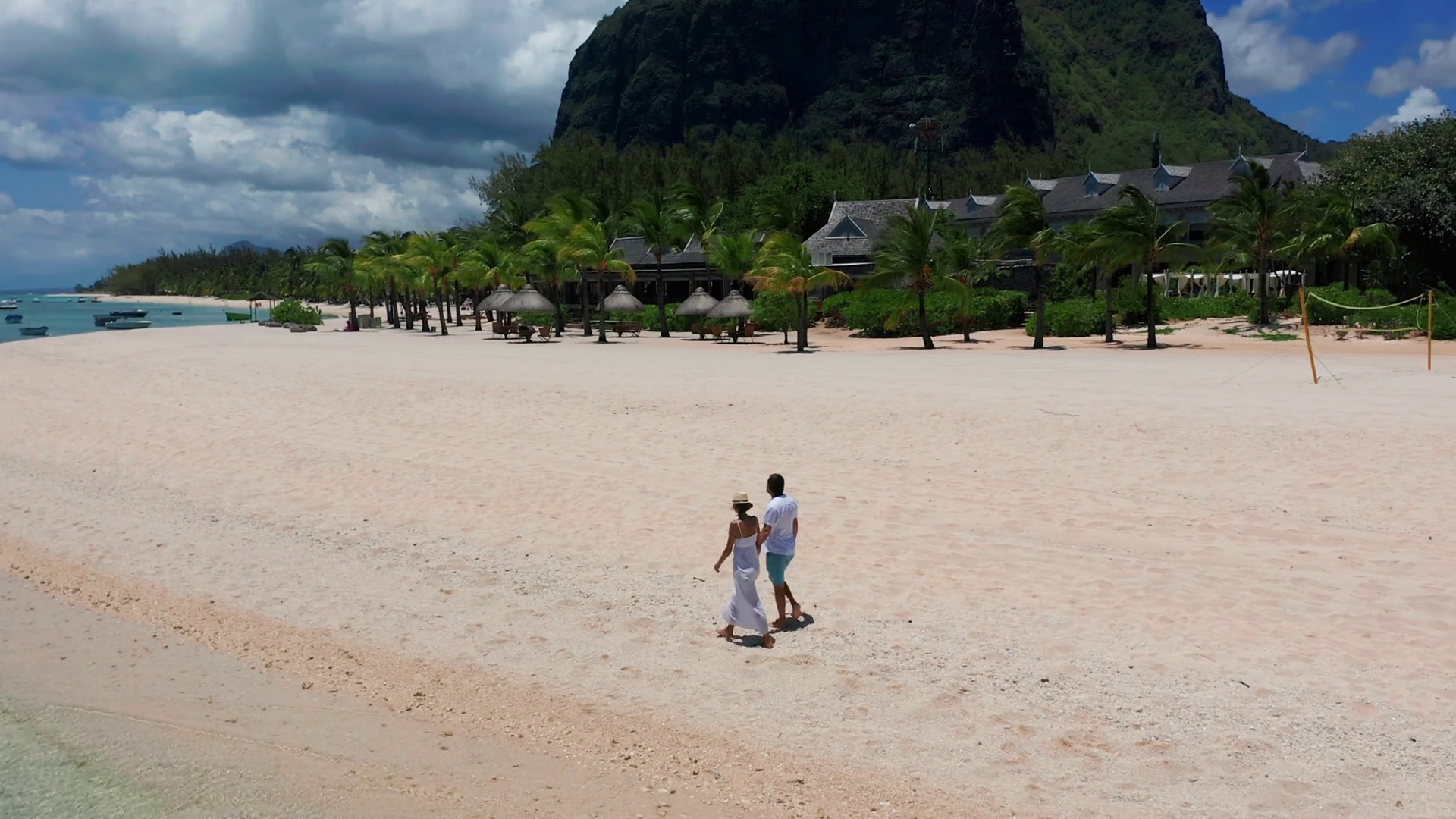 Couple Enjoying Beach Walk And Holding Hands Outdoor Leisure By The Tropical Sea Aerial View Maldives IslandÂ