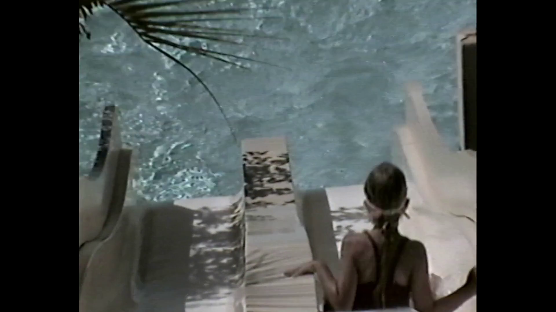 Young Girl Sitting At The Edge Of A Water Slide Ready To Descend Into A Pool Surrounded By Palms