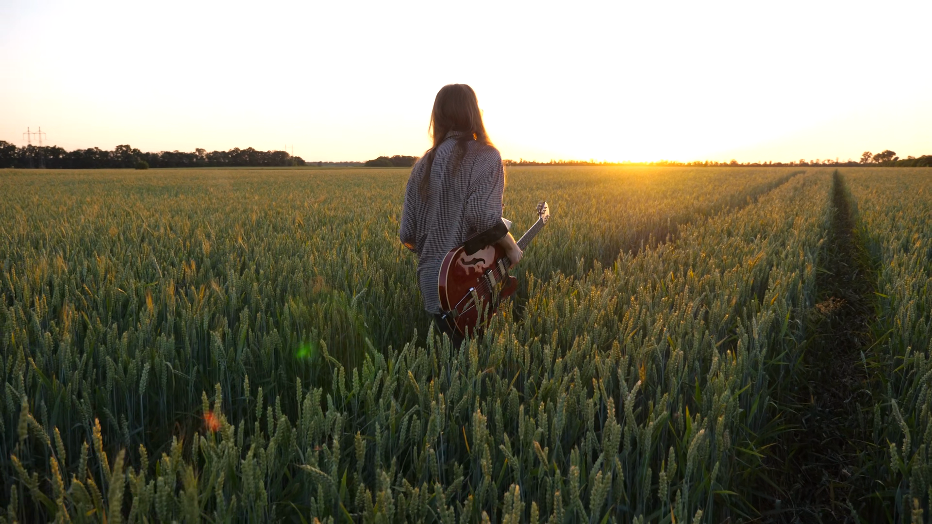 Young Male Hipster With Long Hair Holding Electric Guitar In Hand And Walking Through Wheat Field Hippie Man With Musical Instrument Going Among Green Barley Meadow And Enjoying Nature At SunsetÂ