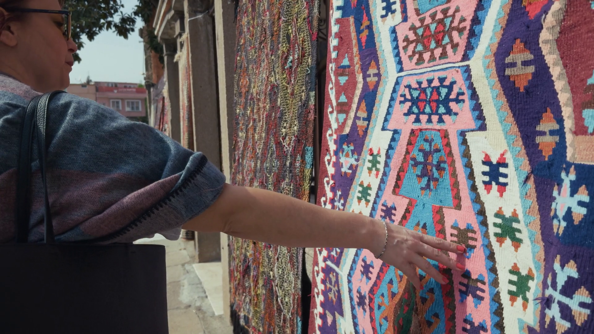 Young Woman Looks At Handmade Carpets With Patterns Unique To AnatoliaÂ