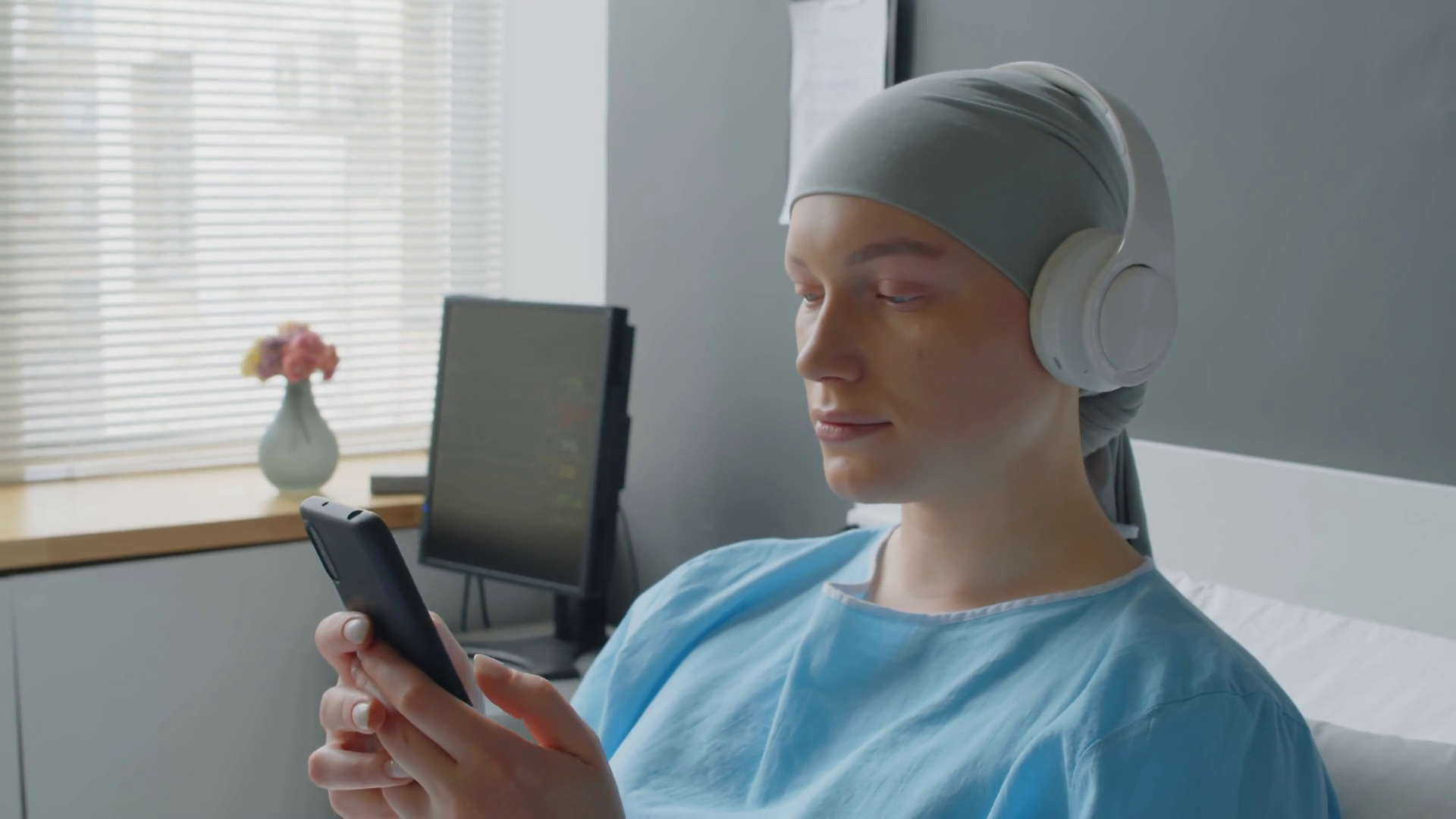 Young Woman Resting After Chemotherapy With Headphones Choosing Music To Listen To On Smartphone While Laying On Bed In WardÂ