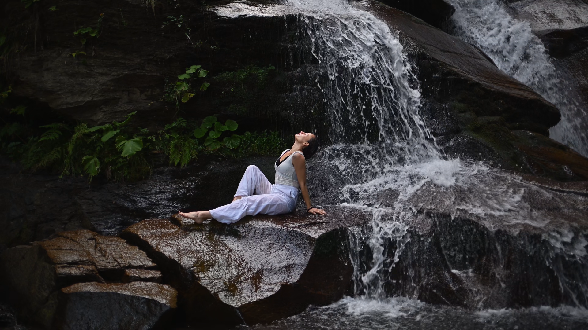 Young Woman Sitting In Lotus Pose Under Tropical Waterfall Meditating With Calm Strength And Mindfulness Fully Connected To Nature EnergyÂ
