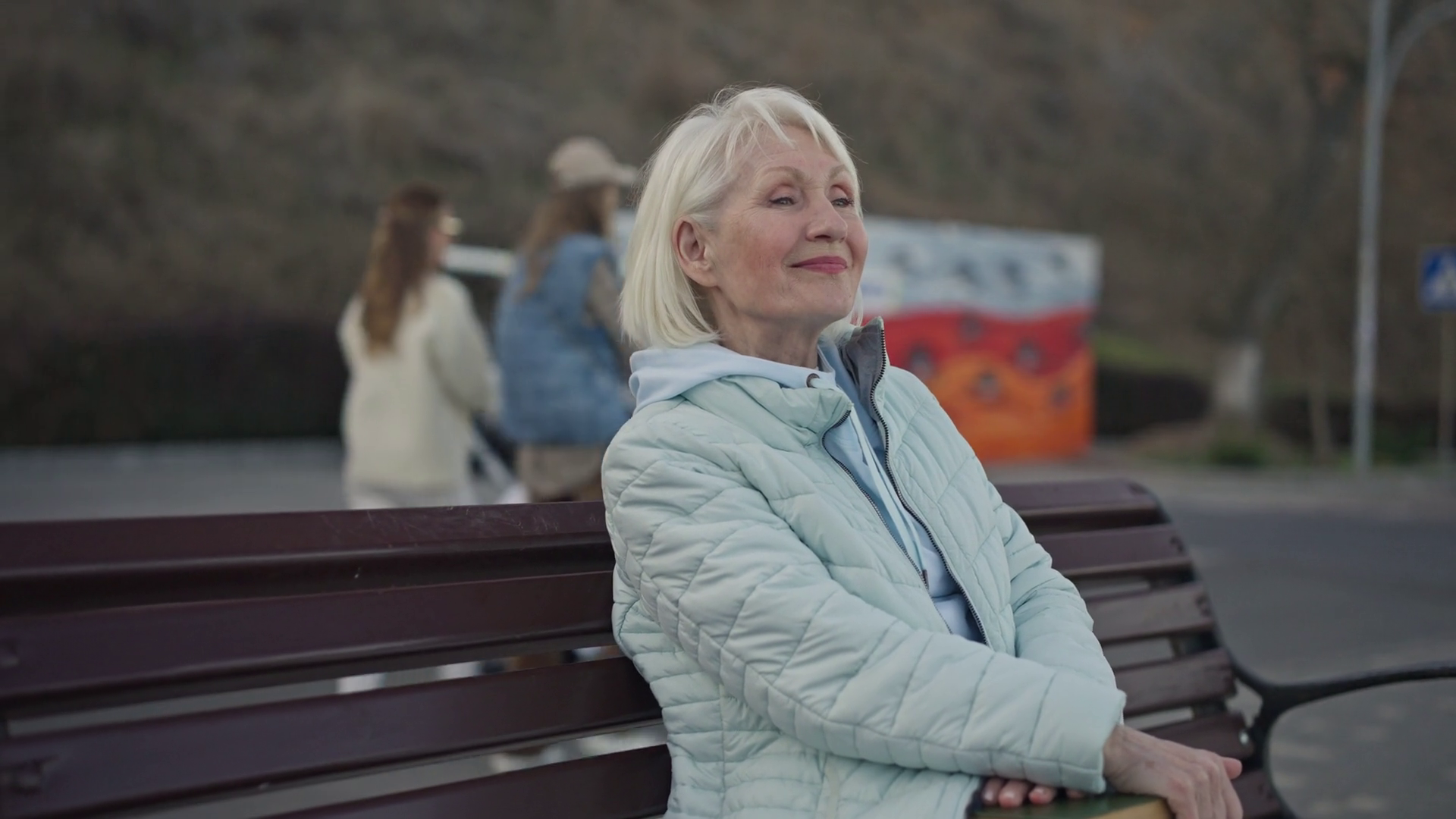 Zoom In Happy Elderly Woman With White Hair Relaxing On Bench And Thoughtfully Looking Up While Enjoying Day In Park Woman Smiling AndÂ
